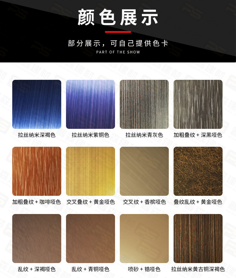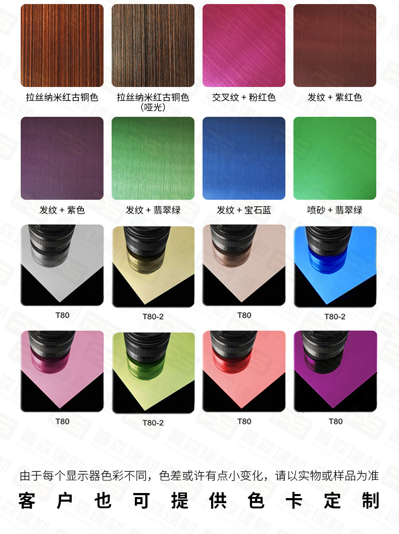 顏色:鈦金、黑鈦、玫瑰金、香檳金、古銅色、寶石藍、咖啡色等,顏色可定制